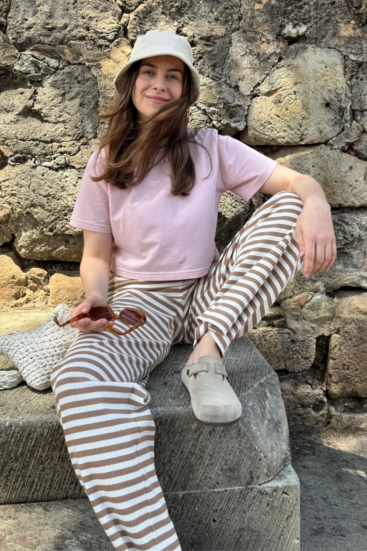 The Leo Pants are a ribbed cotton jersey pants in cinnamon and creme stripes. The fabric is soft, stretchy and very comfortable, with a relaxed straight-leg fit and an elastic waistband.
